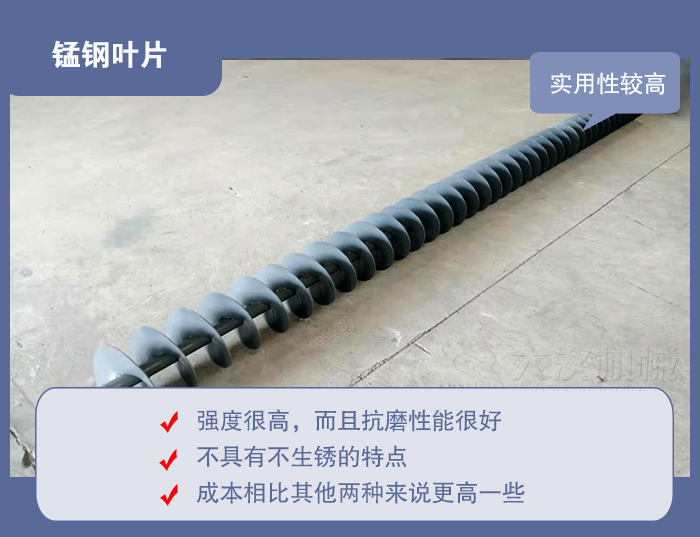 錳鋼螺旋輸送機葉片的強度很高,而且抗磨性能很好,主要是由于錳鋼的錳元素,而錳鋼不具有不生銹的特點,與錳鋼相比,不銹鋼的抗氧化性能以及耐腐蝕性能就很好了,但是強度沒有錳鋼好。