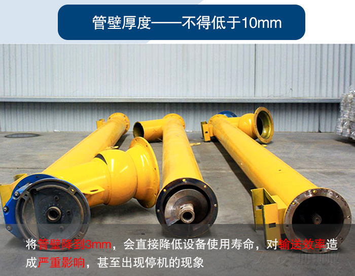 一般情況下,管式螺旋輸送機(jī)管壁厚度要求不低于10mm,有些廠家為了在其中賺取更多利益,將管壁降到了3mm,會(huì)直接降低設(shè)備使用壽命,對(duì)輸送效率造成嚴(yán)重影響,甚至出現(xiàn)停機(jī)的現(xiàn)象。