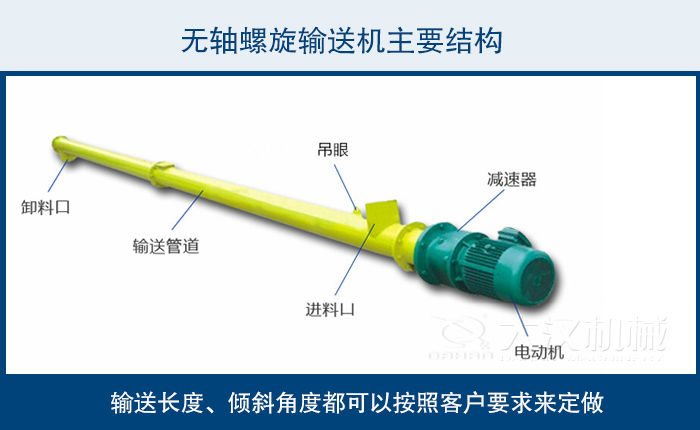 驅(qū)動(dòng)、殼體、襯板、葉片、 支架、蓋板、進(jìn)料口、出料口,輸送長度、傾斜角度都可以按照客戶要求來定做,不同物料不同輸送角度我們?yōu)槟侠磉x型!