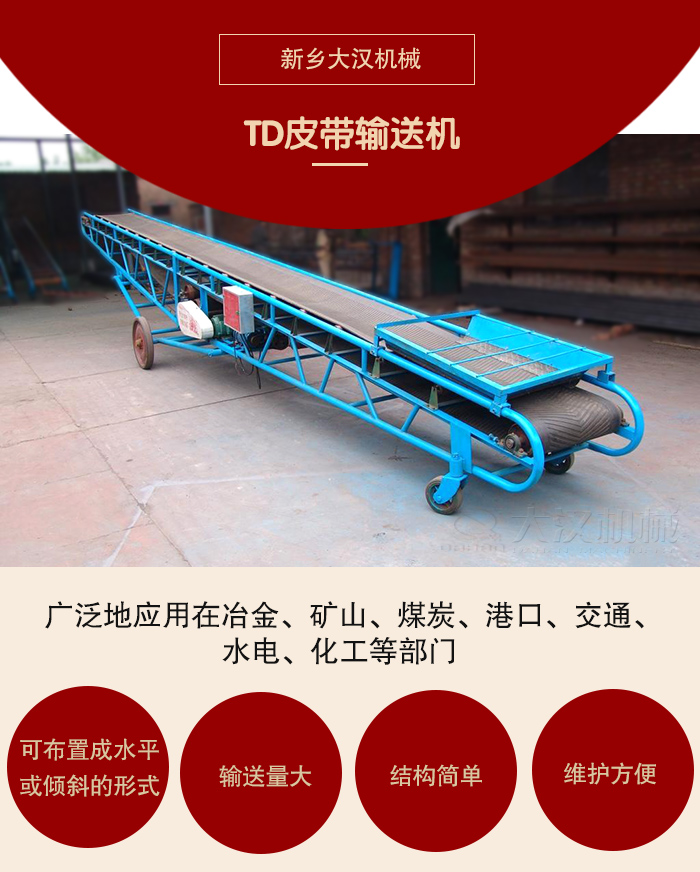 DTⅡ、TD75型帶式輸送機按其支架結構有固定式的移動式兩種:按輸送帶材料有膠帶、塑料帶和鋼芯帶之分。輸送機的工作環境溫度一般在-10oC--+40oC之間,要求物料溫度不超過70oC;耐熱橡膠帶可輸送120oC以下的高溫物料。物料溫度更高時不宜采用膠帶輸送機。